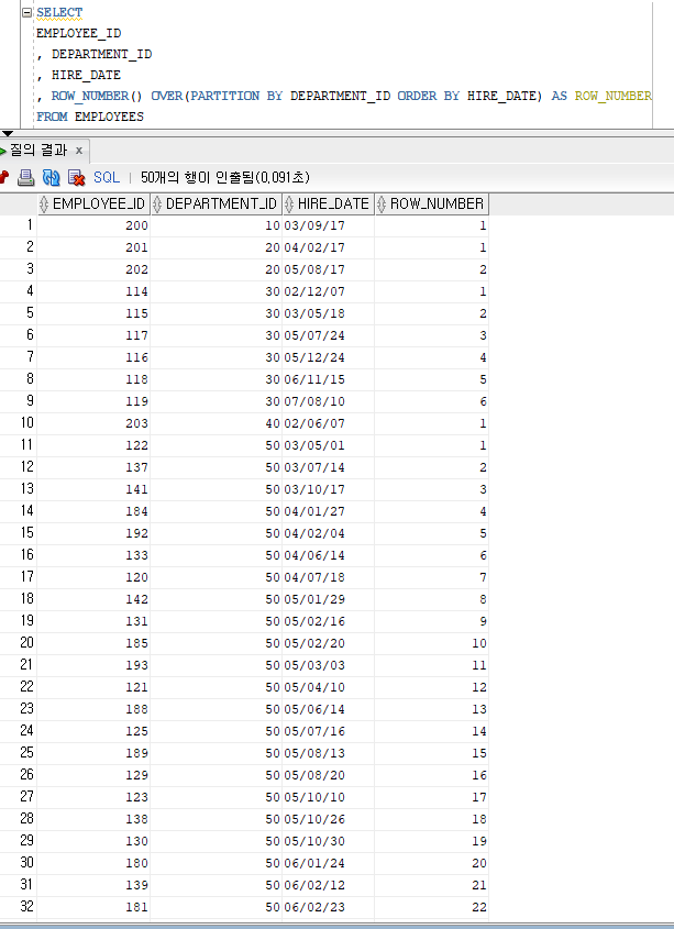 , ROW_NUMBER() OVER(PARTITION BY DEPARTMENT_ID ORDER BY HIRE_DATE) AS ROW_NUMBER
