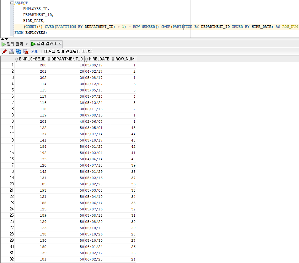 (COUNT(*) OVER(PARTITION BY DEPARTMENT_ID) + 1) - ROW_NUMBER() OVER(PARTITION BY DEPARTMENT_ID ORDER BY HIRE_DATE) AS ROW_NUM