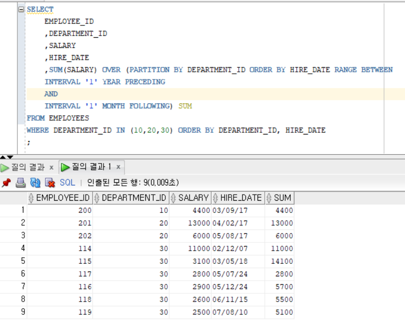 --> HIRE_DATE 컬럼 중, 1 년전 데이터와 1 달뒤 데이터를 SUM()을 하라는 뜻이다.