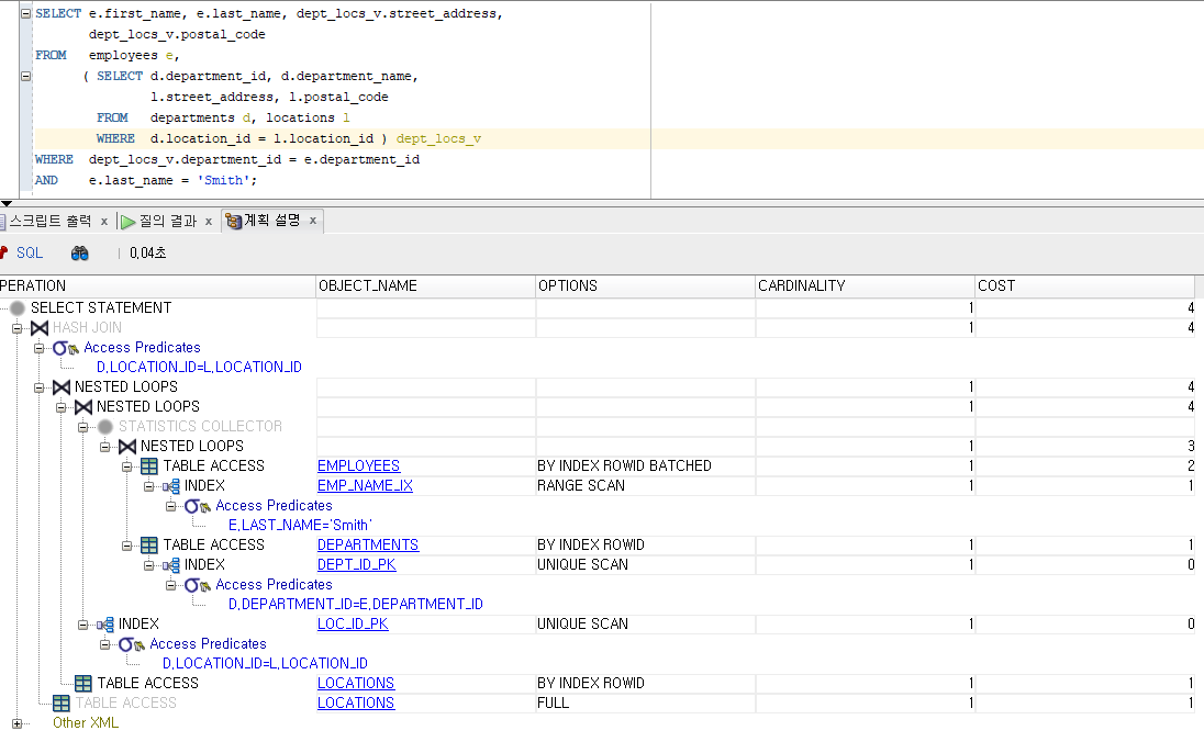 ex4를 보면, 실행 계획을 보면 VIEW가 있다. MERGE(=일반 조인으로 전환)하게 되면, GROUP BY 특성상, 결과 값이 바뀌기 때문에, VIEW Operator를 실행 계획에 추가한 것을 알 수 있다.