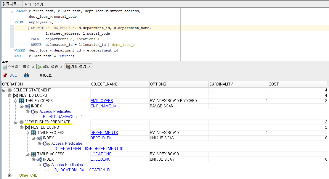 참고로, ex1의 실행 계획을 보면, VIEW PUSH PREDICATE라는 글자가 보인다.